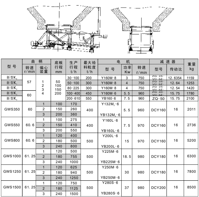 GWS雙推桿往復(fù)給料機由機架、底板(給煤槽)、傳動平臺、漏頭號、閘門、托輥組成,當電機開動后經(jīng)彈性聯(lián)軸器、減速機、曲柄連桿機構(gòu)拖動傾斜5度的底板在輥上作直線往復(fù)運動,煤均勻地卸到其它設(shè)備上。